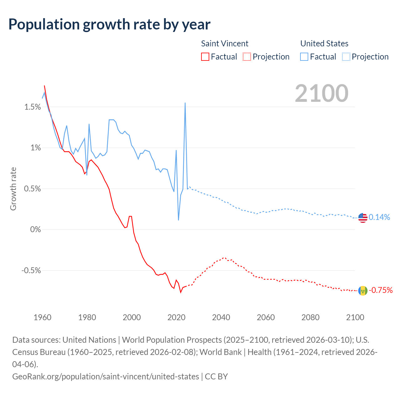 - For the last 10 years, Saint Vincent has had an average growth rate of -0.65% per year vs +0.65% in the United States.