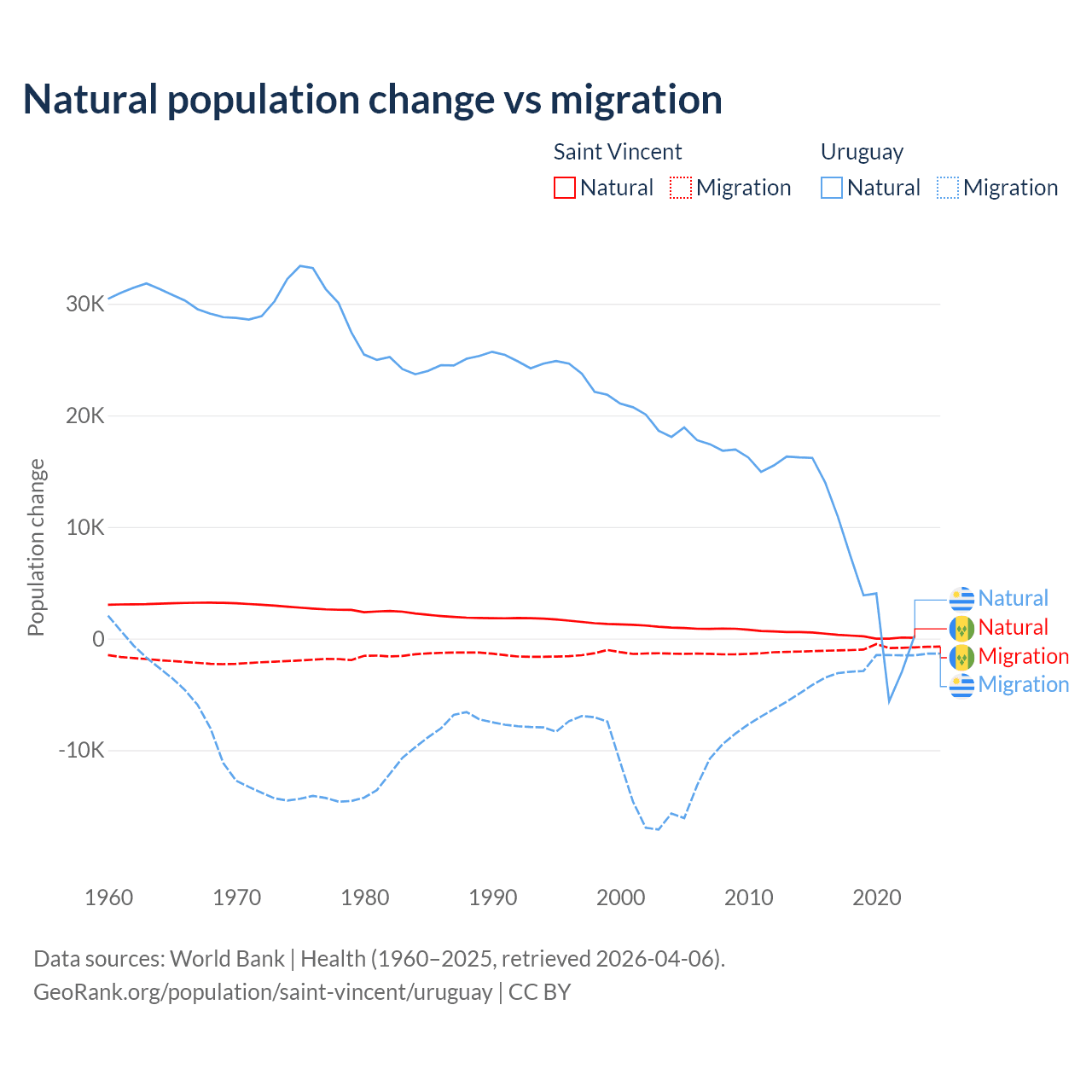 Over the last 10 years, 21.2% of the population change in Saint Vincent is from natural causes (a gain of 2,525 people) and 78.8% is from migration (a loss of 9,393 people). In Uruguay 70% is from natural causes (a gain of 64,303 people) and 30% is from migration (a loss of 27,501 people).