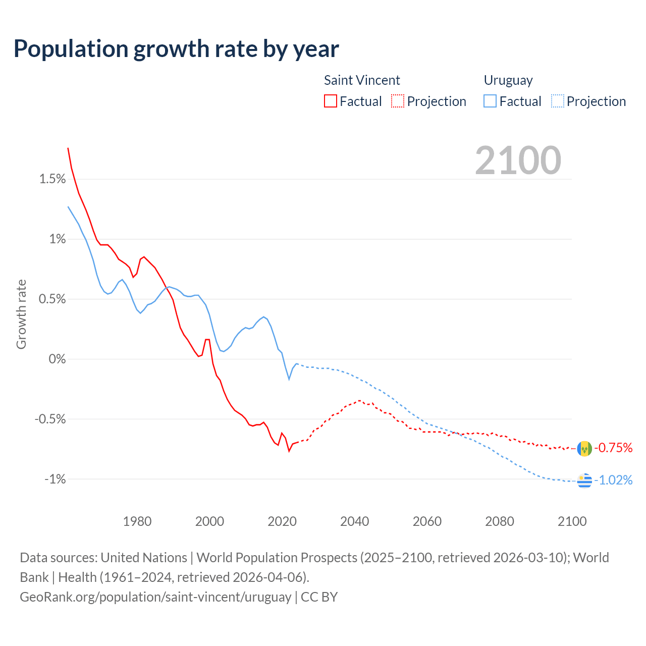 - For the last 10 years, Saint Vincent has had an average growth rate of -0.65% per year vs +0.11% in Uruguay.