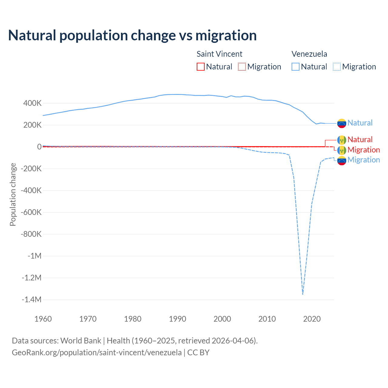 Over the last 10 years, 21.2% of the population change in Saint Vincent is from natural causes (a gain of 2,525 people) and 78.8% is from migration (a loss of 9,393 people). In Venezuela 38.6% is from natural causes (a gain of 2,946,257 people) and 61.4% is from migration (a loss of 4,683,227 people).