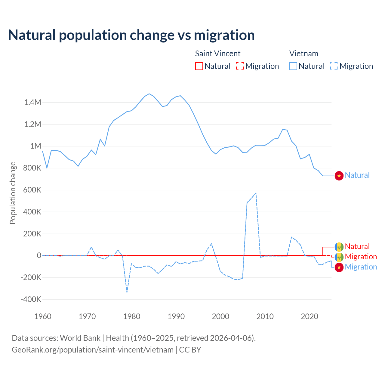 Over the last 10 years, 21.2% of the population change in Saint Vincent is from natural causes (a gain of 2,525 people) and 78.8% is from migration (a loss of 9,393 people). In Vietnam 97.7% is from natural causes (a gain of 9,349,756 people) and 2.29% is from migration (a gain of 219,073 people).