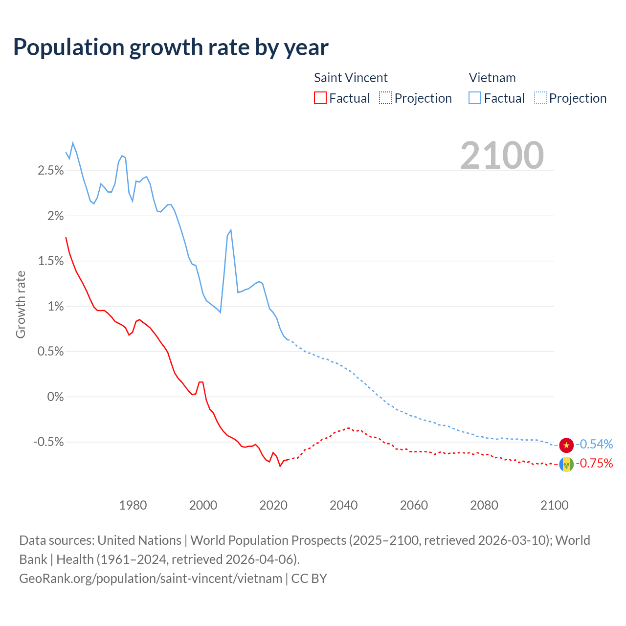 - For the last 10 years, Saint Vincent has had an average growth rate of -0.65% per year vs +0.99% in Vietnam.