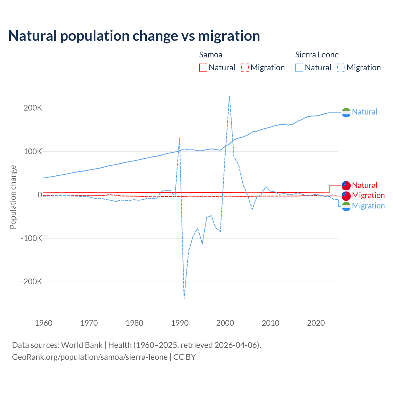 Over the last 10 years, 62.5% of the population change in Samoa is from natural causes (a gain of 45,436 people) and 37.5% is from migration (a loss of 27,246 people). In Sierra Leone 99.6% is from natural causes (a gain of 1,764,049 people) and 0.41% is from migration (a loss of 7,211 people).