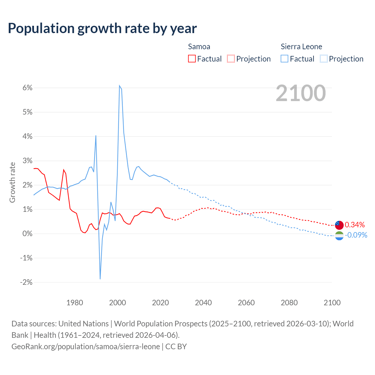 - For the last 10 years, Samoa has had an average growth rate of +0.87% per year vs +2.32% in Sierra Leone.