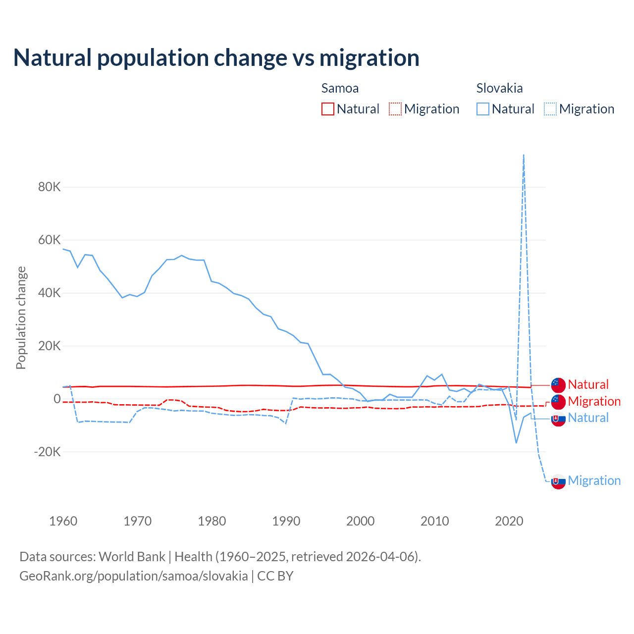 Over the last 10 years, 62.5% of the population change in Samoa is from natural causes (a gain of 45,436 people) and 37.5% is from migration (a loss of 27,246 people). In Slovakia 7.47% is from natural causes (a loss of 8,728 people) and 92.5% is from migration (a gain of 108,156 people).