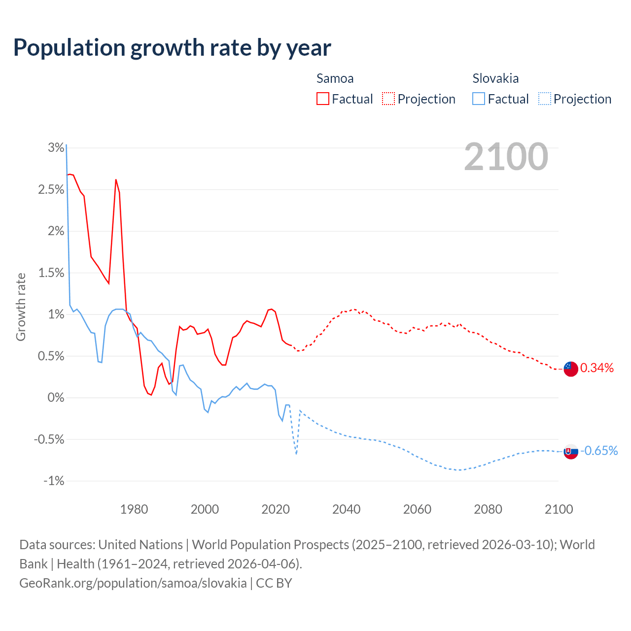 - For the last 10 years, Samoa has had an average growth rate of +0.87% per year vs +0.01% in Slovakia.