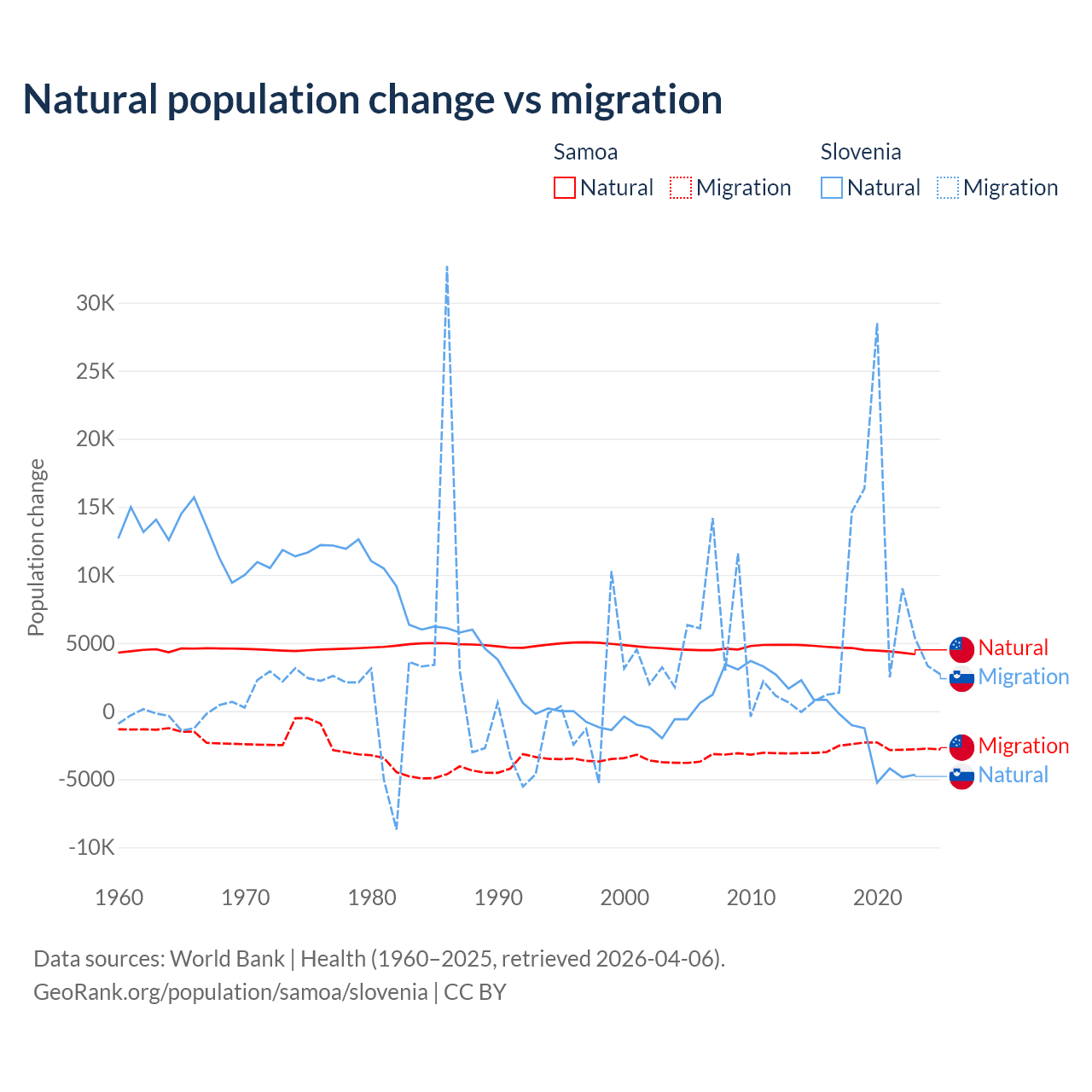 Over the last 10 years, 62.5% of the population change in Samoa is from natural causes (a gain of 45,436 people) and 37.5% is from migration (a loss of 27,246 people). In Slovenia 18.1% is from natural causes (a loss of 17,573 people) and 81.9% is from migration (a gain of 79,532 people).