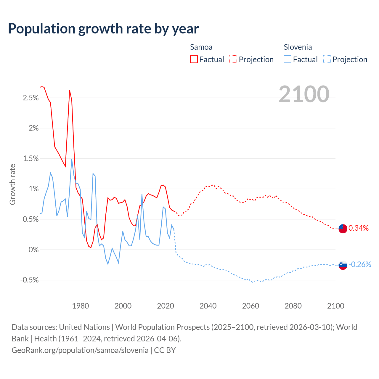- For the last 10 years, Samoa has had an average growth rate of +0.87% per year vs +0.29% in Slovenia.