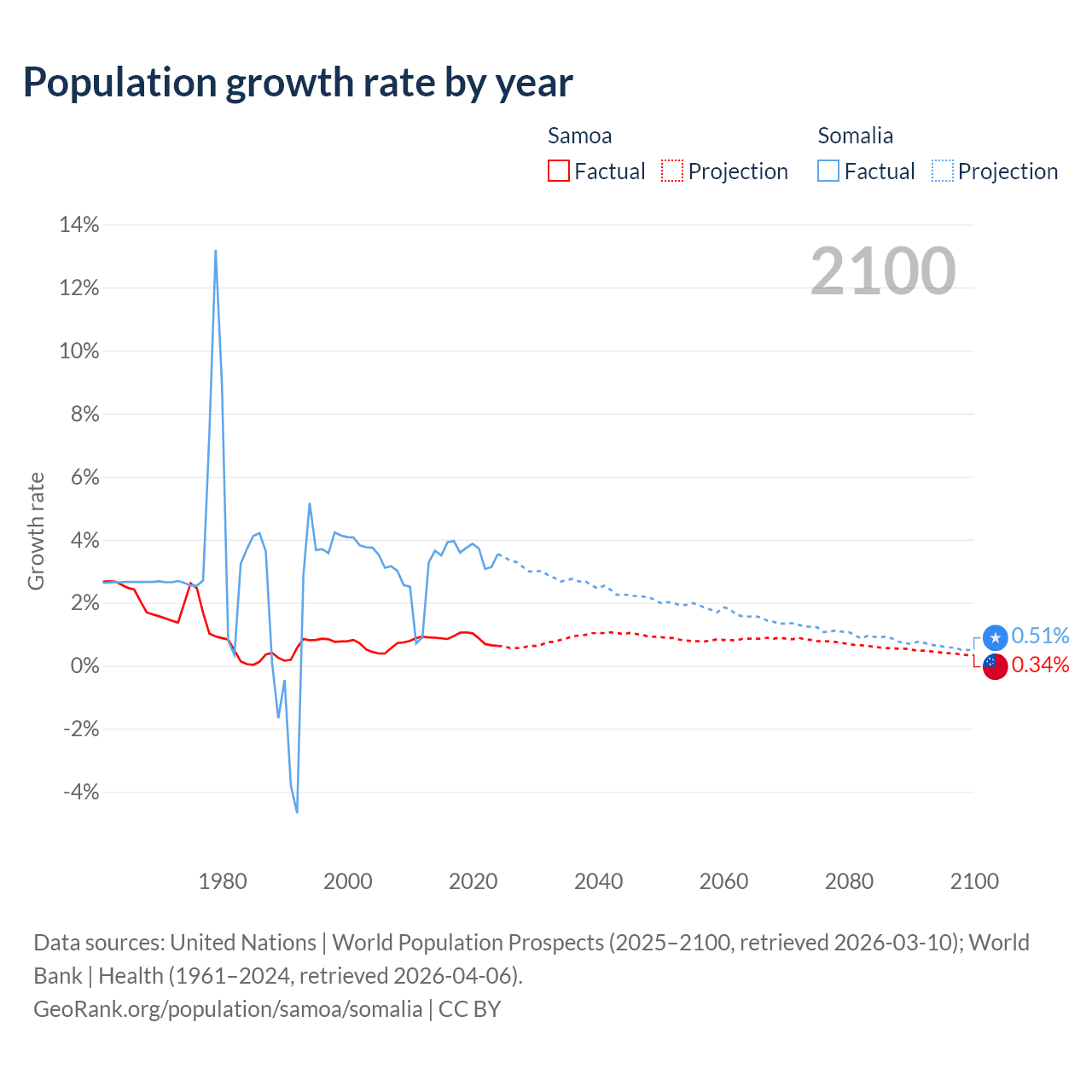 - For the last 10 years, Samoa has had an average growth rate of +0.87% per year vs +3.61% in Somalia.