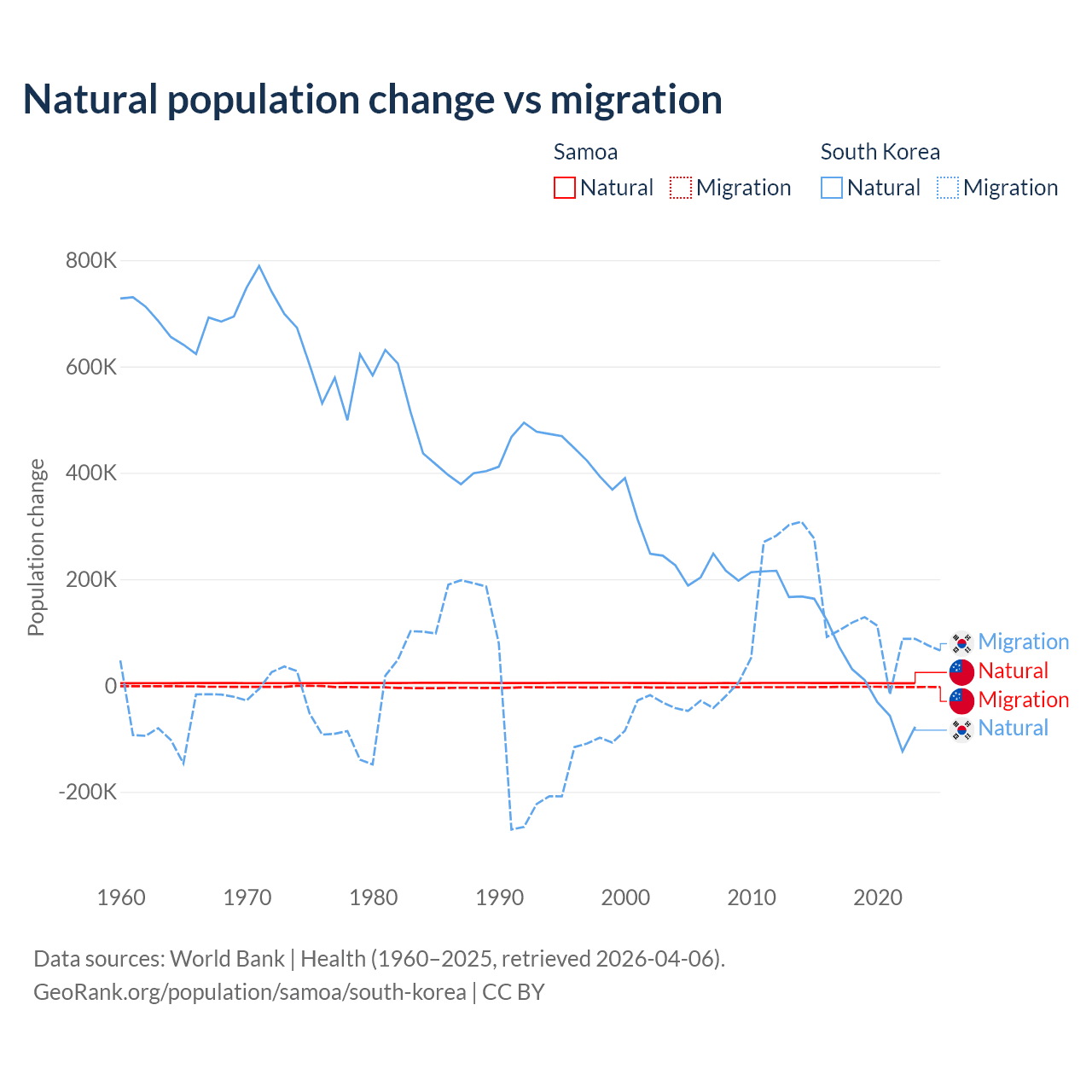 Over the last 10 years, 62.5% of the population change in Samoa is from natural causes (a gain of 45,436 people) and 37.5% is from migration (a loss of 27,246 people). In South Korea 17.6% is from natural causes (a gain of 277,215 people) and 82.4% is from migration (a gain of 1,298,356 people).