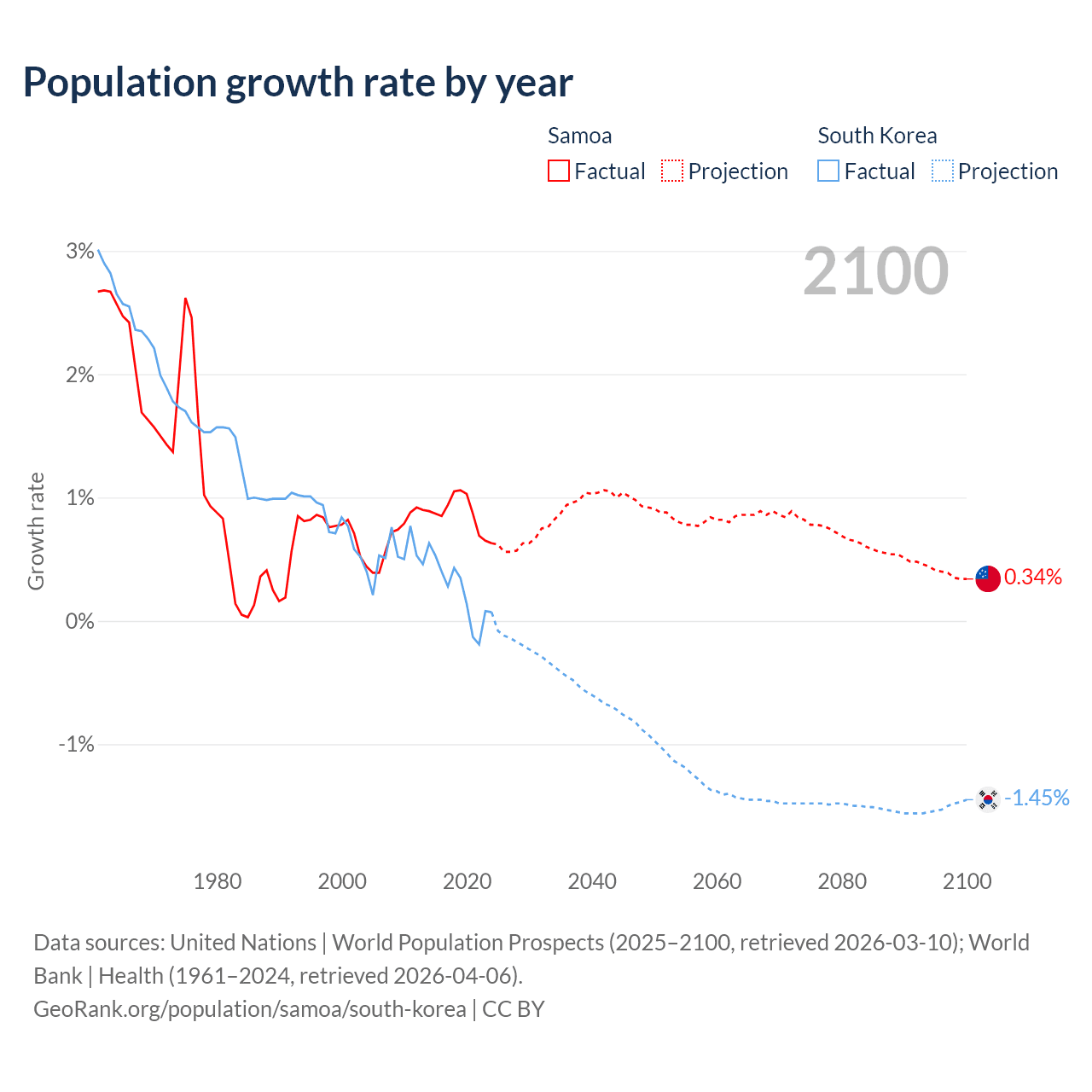- For the last 10 years, Samoa has had an average growth rate of +0.87% per year vs +0.24% in South Korea.
