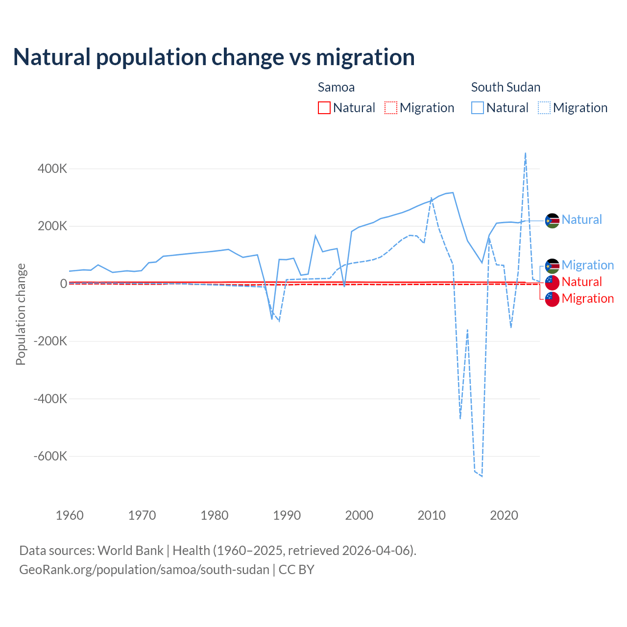 Over the last 10 years, 62.5% of the population change in Samoa is from natural causes (a gain of 45,436 people) and 37.5% is from migration (a loss of 27,246 people). In South Sudan 57.4% is from natural causes (a gain of 1,792,135 people) and 42.6% is from migration (a loss of 1,329,606 people).