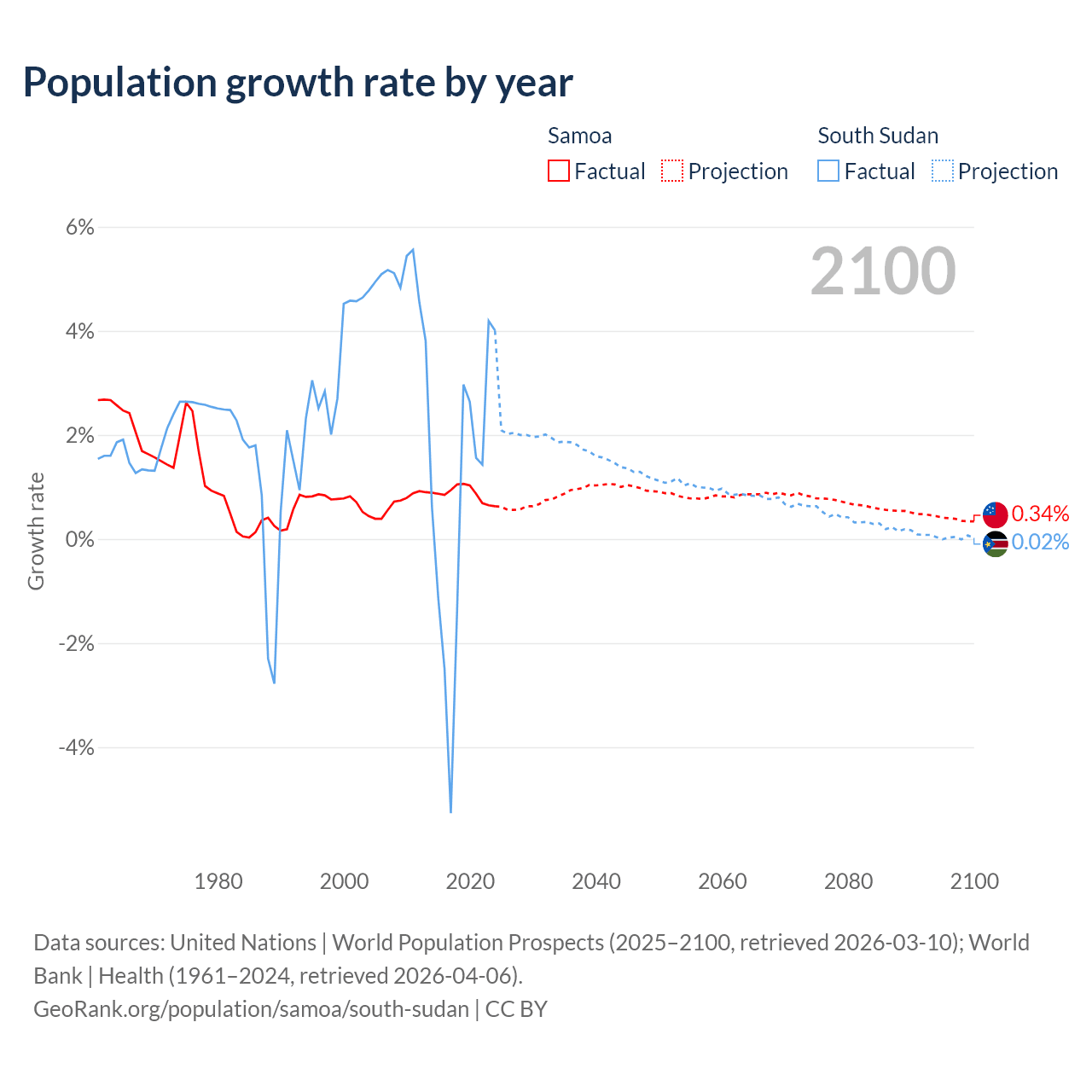- For the last 10 years, Samoa has had an average growth rate of +0.87% per year vs +0.65% in South Sudan.