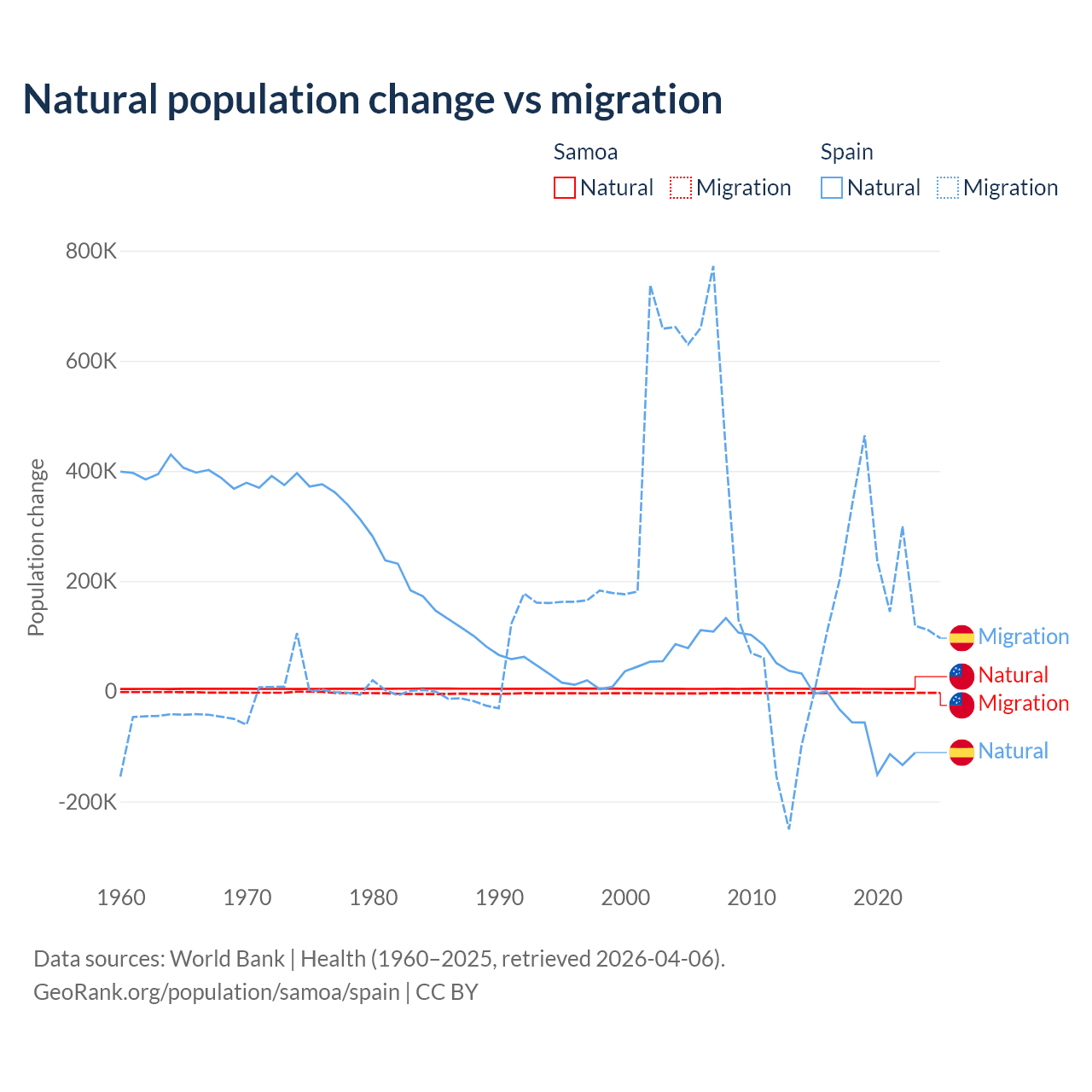 Over the last 10 years, 62.5% of the population change in Samoa is from natural causes (a gain of 45,436 people) and 37.5% is from migration (a loss of 27,246 people). In Spain 25.8% is from natural causes (a loss of 627,829 people) and 74.2% is from migration (a gain of 1,810,127 people).