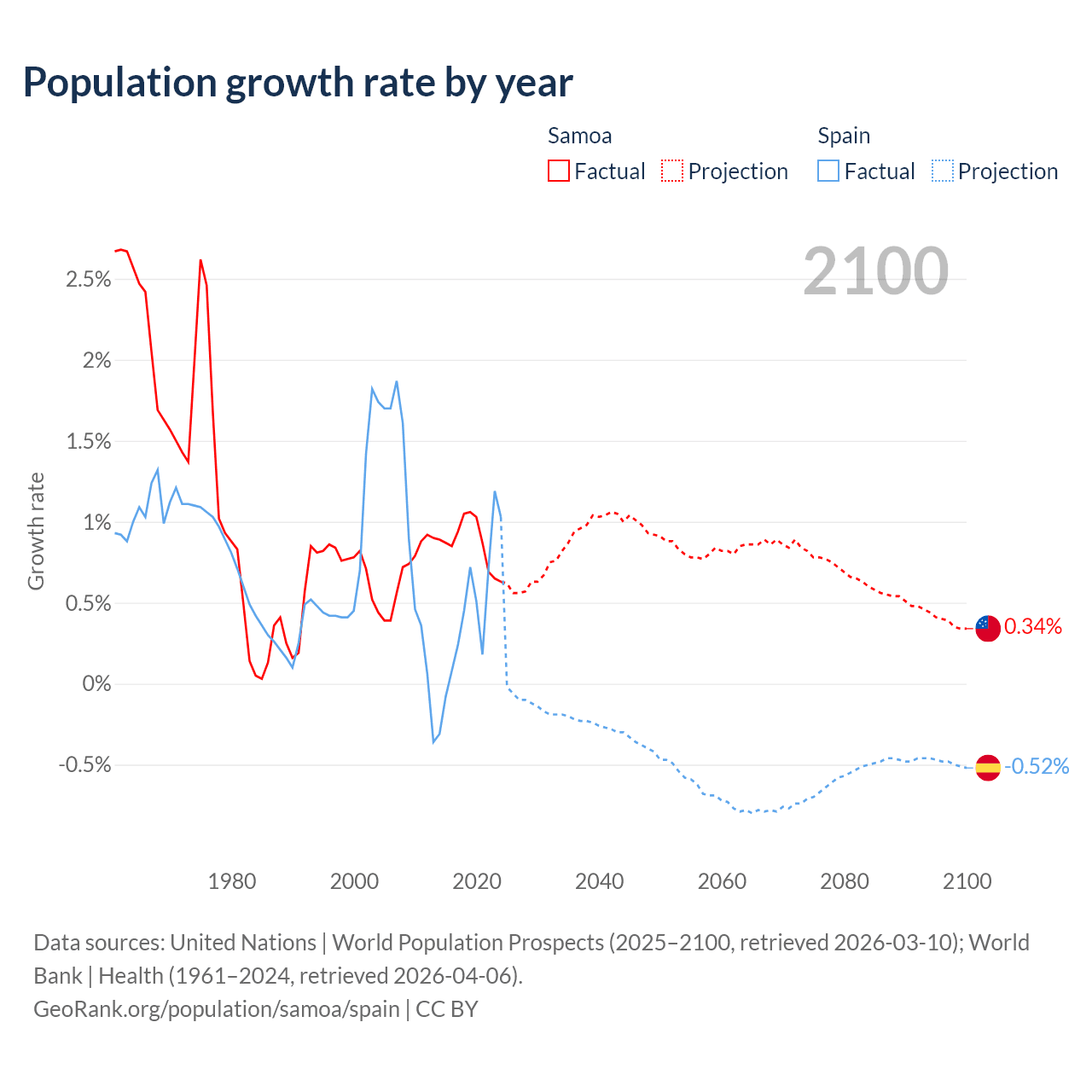 - For the last 10 years, Samoa has had an average growth rate of +0.87% per year vs +0.43% in Spain.