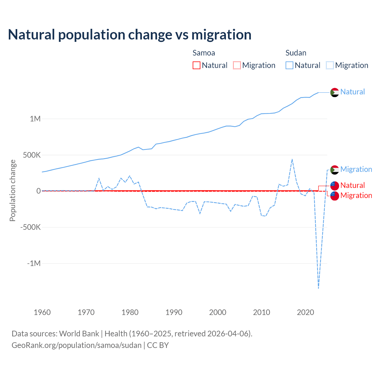 Over the last 10 years, 62.5% of the population change in Samoa is from natural causes (a gain of 45,436 people) and 37.5% is from migration (a loss of 27,246 people). In Sudan 95.1% is from natural causes (a gain of 12,459,977 people) and 4.88% is from migration (a loss of 639,596 people).