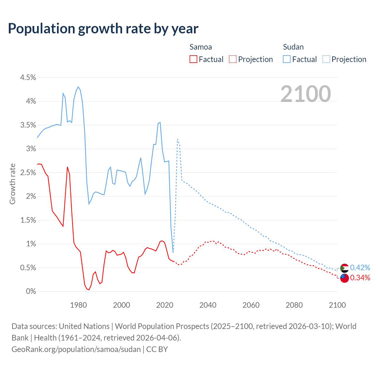 - For the last 10 years, Samoa has had an average growth rate of +0.87% per year vs +2.67% in Sudan.