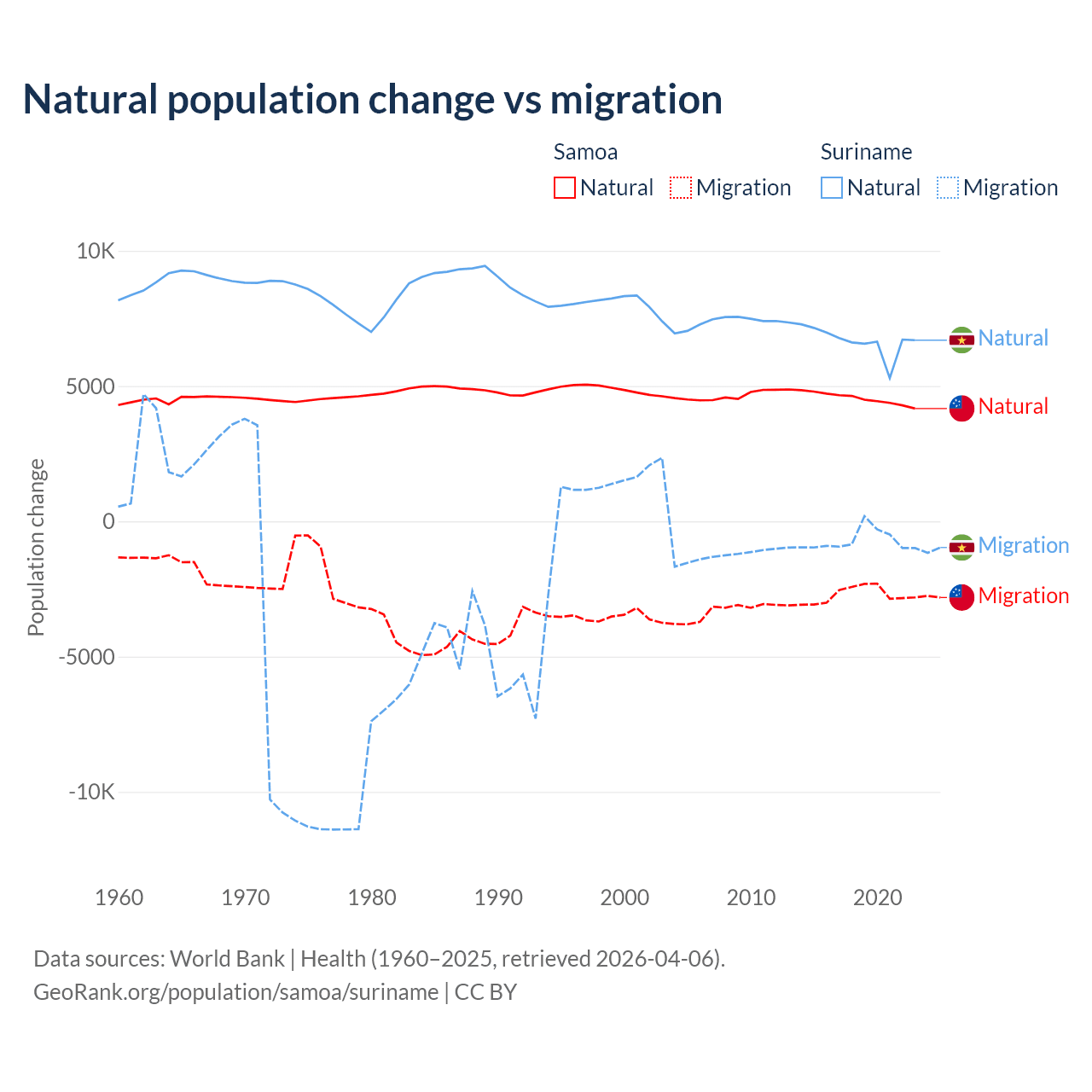 Over the last 10 years, 62.5% of the population change in Samoa is from natural causes (a gain of 45,436 people) and 37.5% is from migration (a loss of 27,246 people). In Suriname 90.3% is from natural causes (a gain of 66,709 people) and 9.72% is from migration (a loss of 7,185 people).