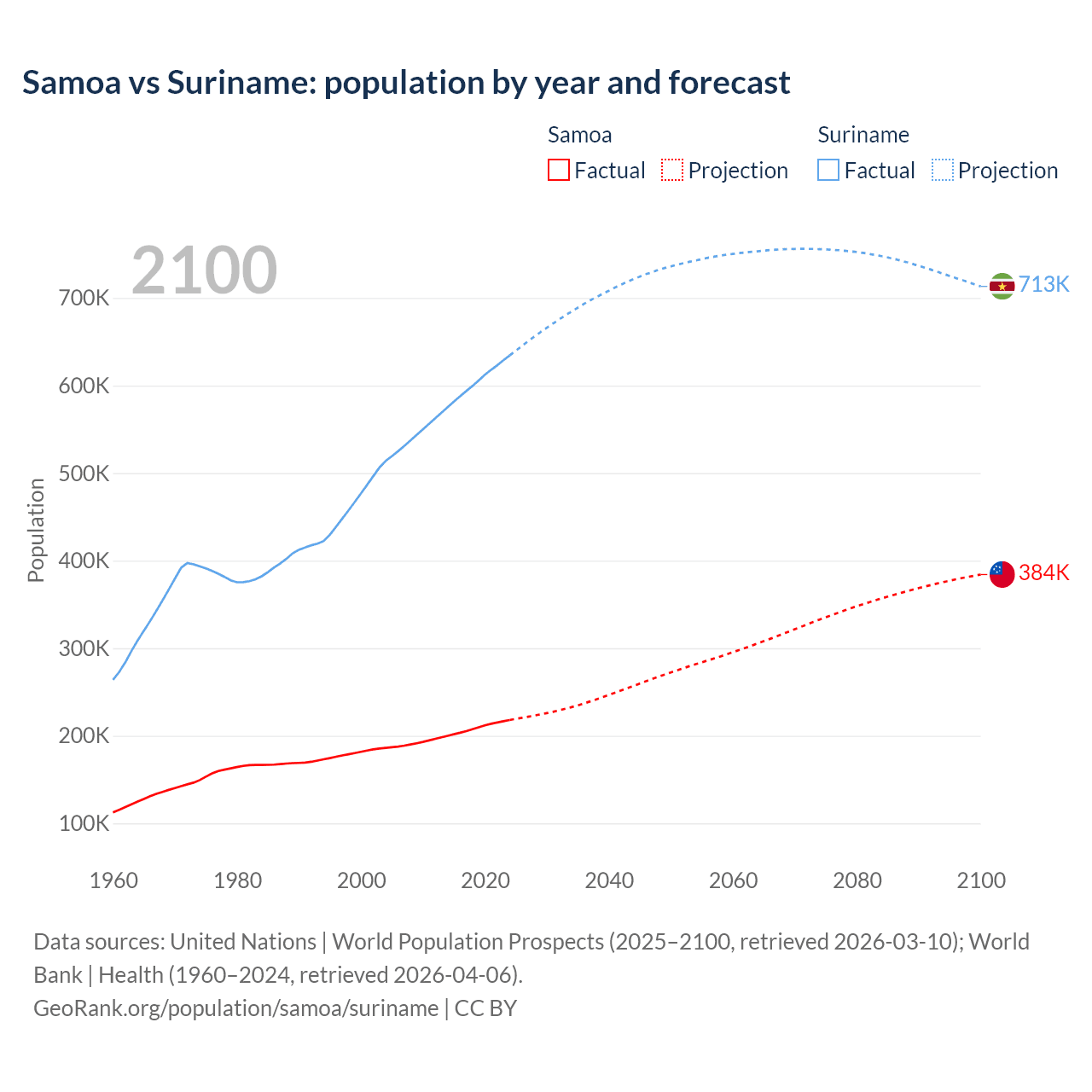The latest officially reported population of Samoa was 218,019 in 2024 vs 634,431 people in Suriname in 2024. In 2026, based on the adjusted UN estimation, the current Samoa's population is 220,932 people compared to 646,767 in Suriname.