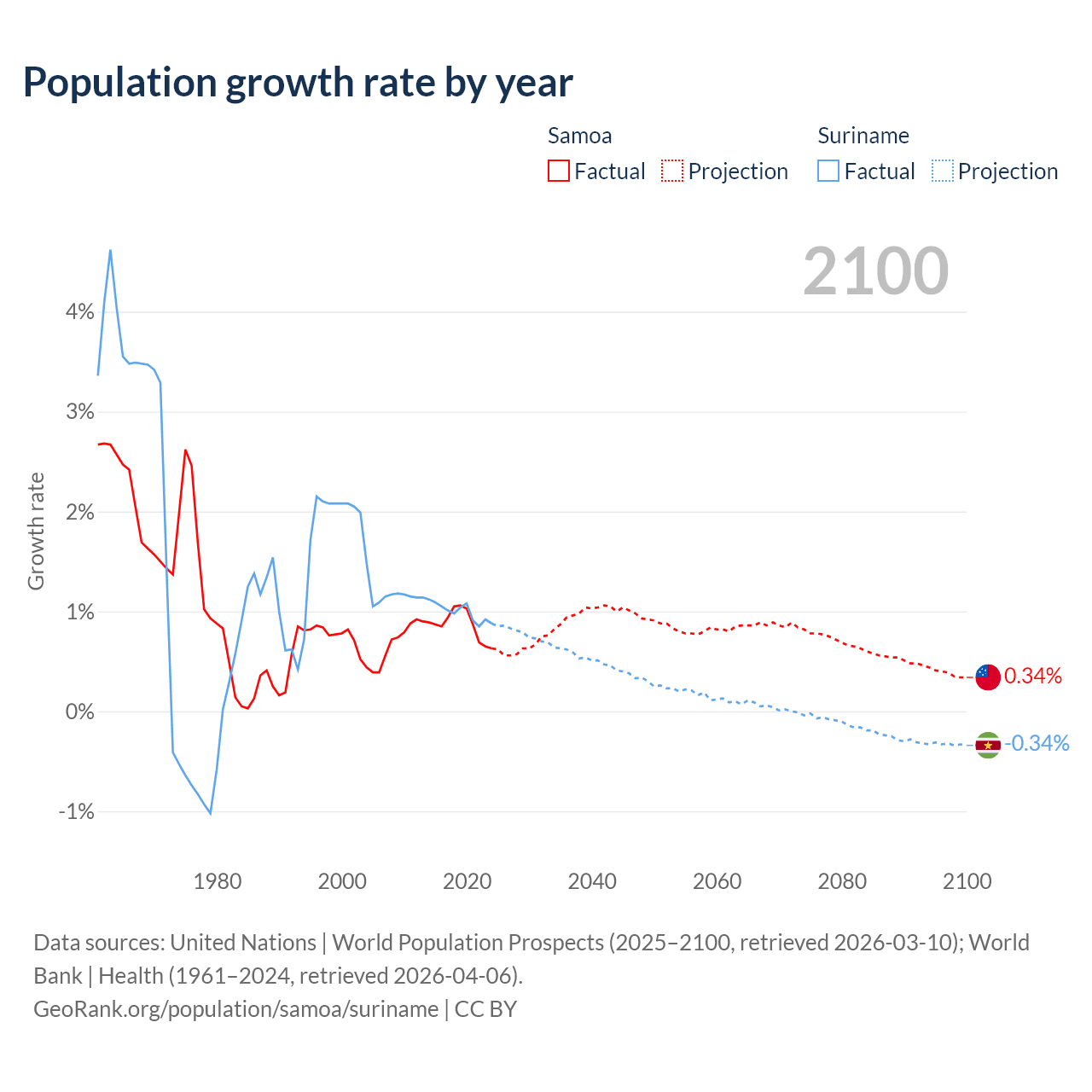 - For the last 10 years, Samoa has had an average growth rate of +0.87% per year vs +0.99% in Suriname.