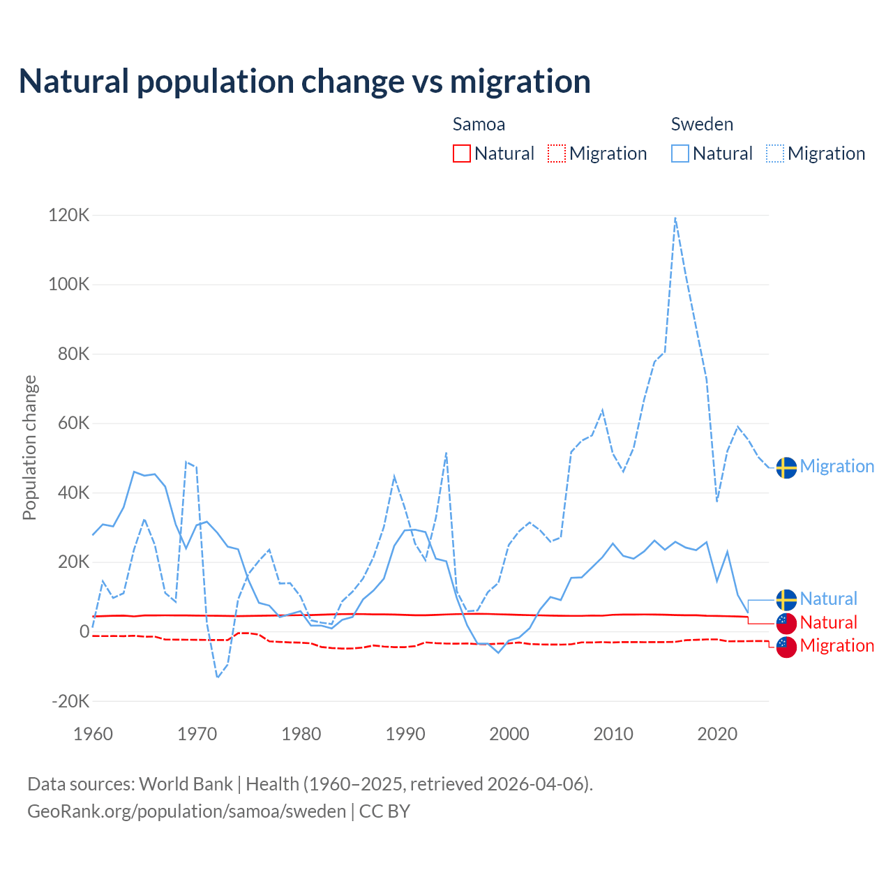 Over the last 10 years, 62.5% of the population change in Samoa is from natural causes (a gain of 45,436 people) and 37.5% is from migration (a loss of 27,246 people). In Sweden 21.4% is from natural causes (a gain of 201,900 people) and 78.6% is from migration (a gain of 743,642 people).