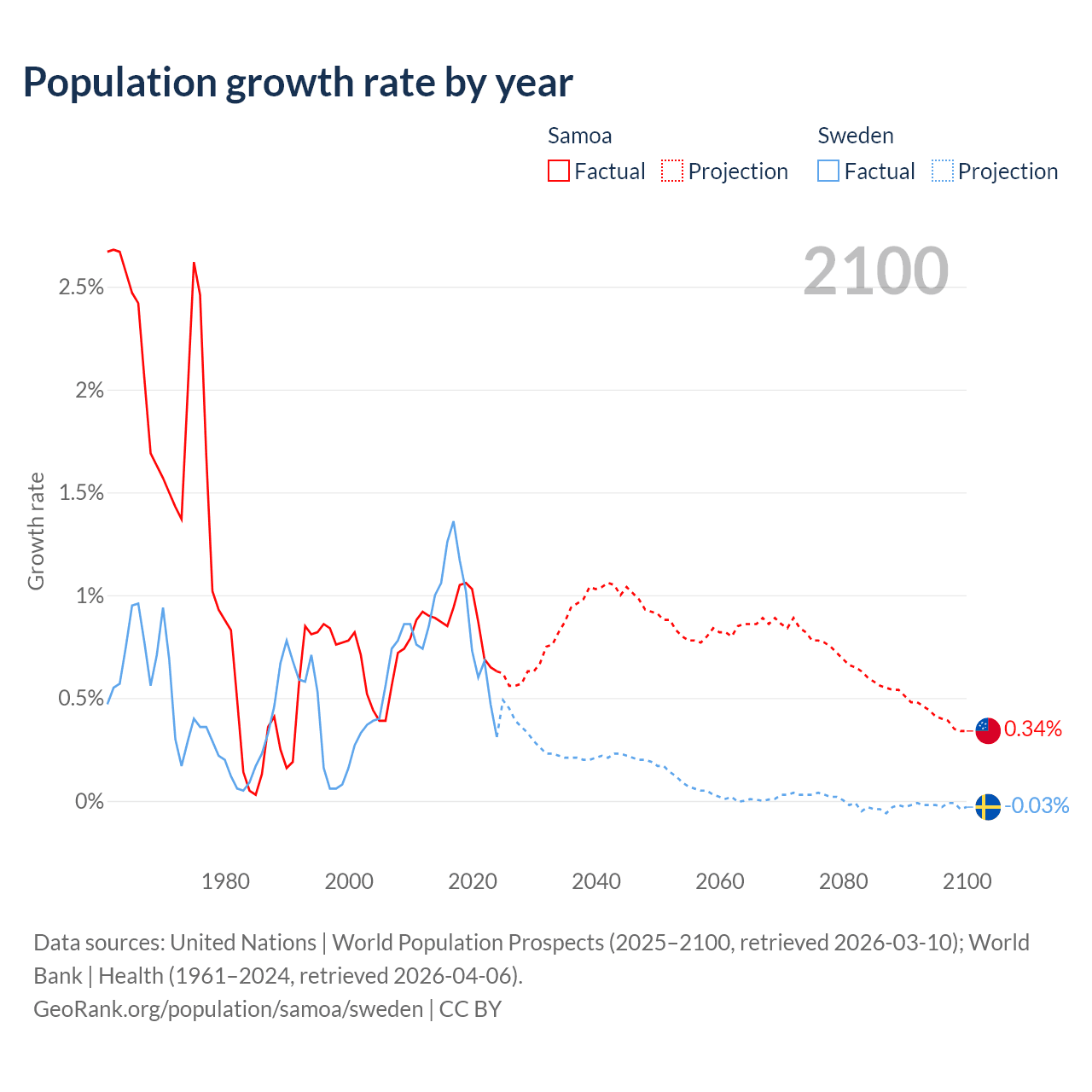 - For the last 10 years, Samoa has had an average growth rate of +0.87% per year vs +0.88% in Sweden.