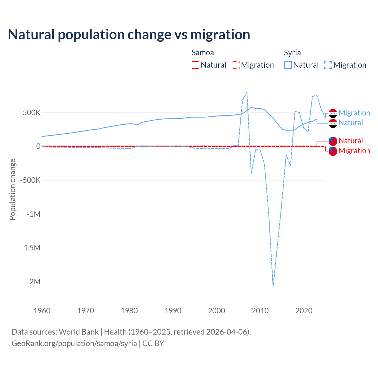 Over the last 10 years, 62.5% of the population change in Samoa is from natural causes (a gain of 45,436 people) and 37.5% is from migration (a loss of 27,246 people). In Syria 91.3% is from natural causes (a gain of 3,047,621 people) and 8.72% is from migration (a gain of 291,069 people).