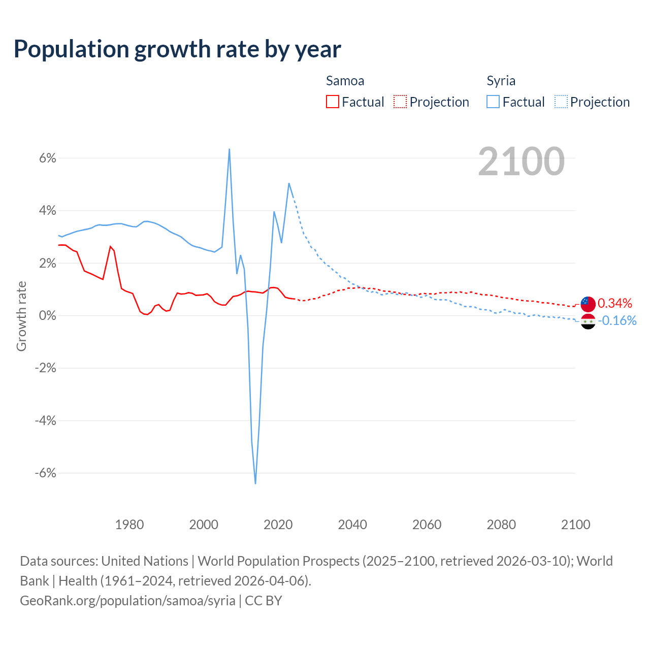 - For the last 10 years, Samoa has had an average growth rate of +0.87% per year vs +1.25% in Syria.