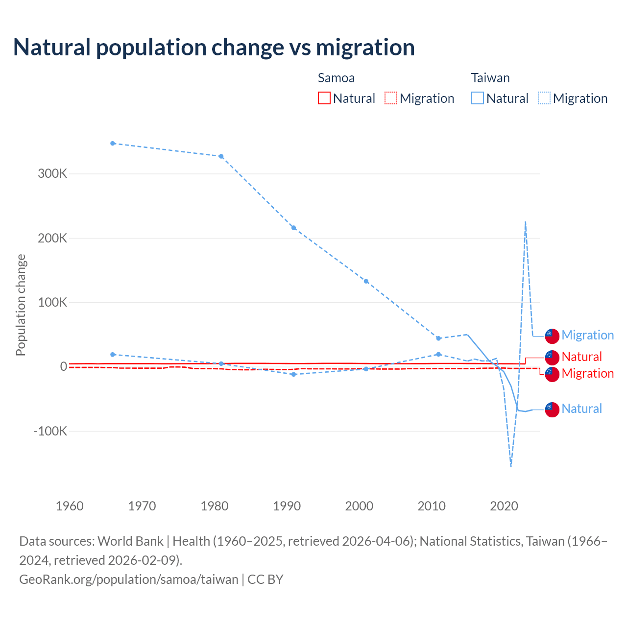Over the last 10 years, 62.5% of the population change in Samoa is from natural causes (a gain of 45,436 people) and 37.5% is from migration (a loss of 27,246 people). In Taiwan 56.7% is from natural causes (a loss of 57,467 people) and 43.3% is from migration (a gain of 43,884 people).
