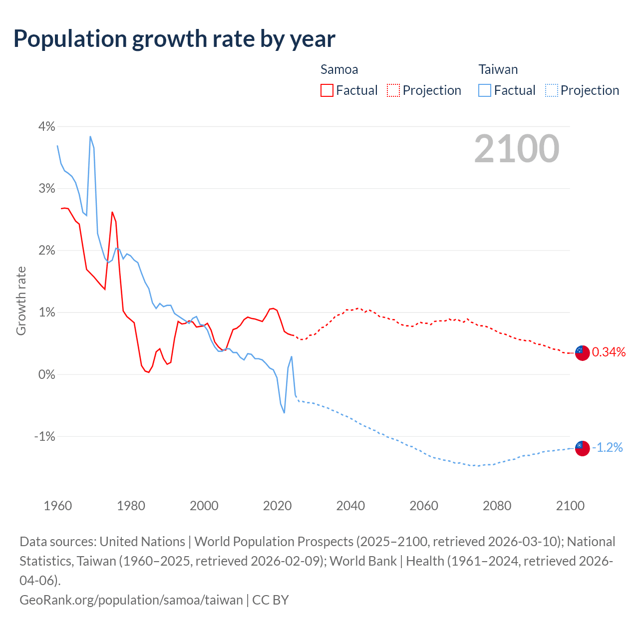 Data sources: World Bank | Health (1960–2024, retrieved 2026-04-06); United Nations | World Population Prospects (1960–2026, retrieved 2026-03-10); U.S. Census Bureau (1960–2025, retrieved 2026-02-08); National Statistics, Taiwan (1960–2025, retrieved 2026-02-09); Central Intelligence Agency (CIA) (2000–2019, retrieved 2026-02-20).