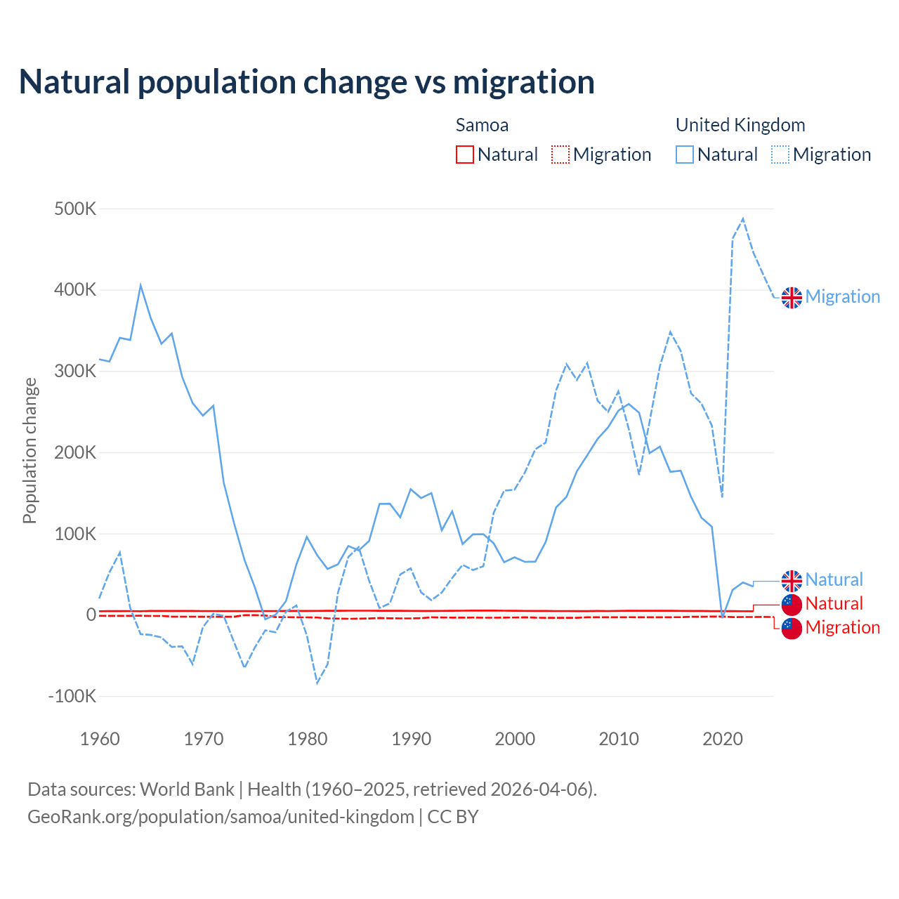 Over the last 10 years, 62.5% of the population change in Samoa is from natural causes (a gain of 45,436 people) and 37.5% is from migration (a loss of 27,246 people). In the United Kingdom 23.9% is from natural causes (a gain of 1,033,129 people) and 76.1% is from migration (a gain of 3,283,101 people).