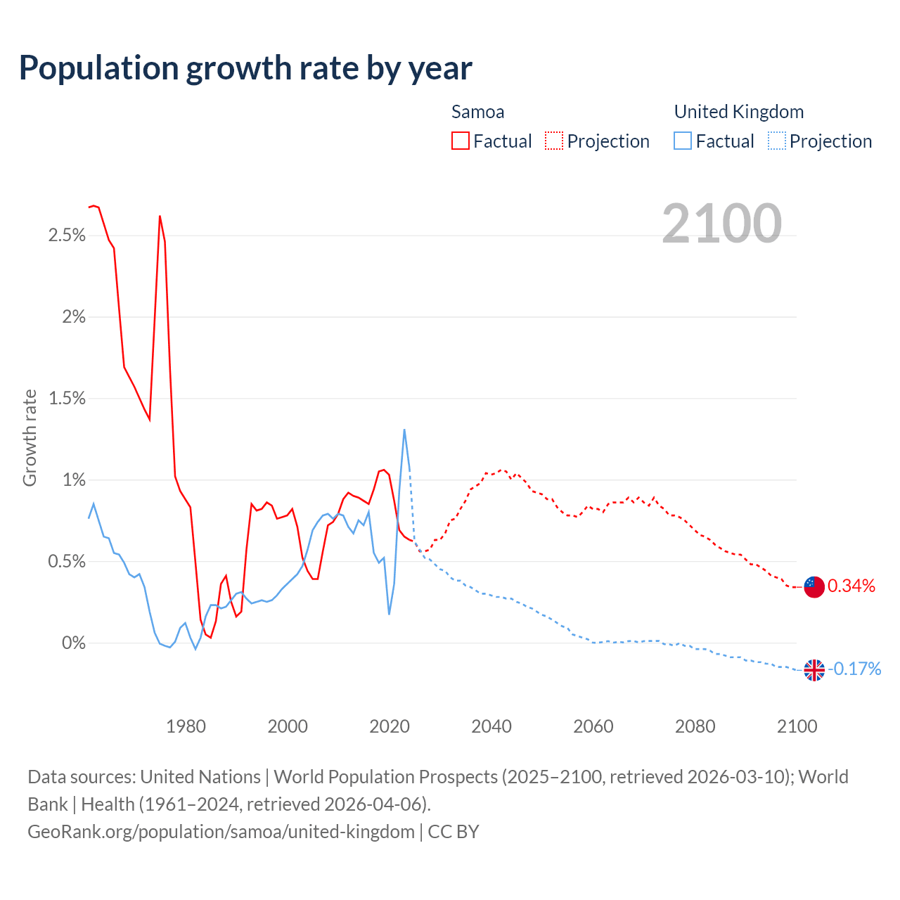 - For the last 10 years, Samoa has had an average growth rate of +0.87% per year vs +0.7% in the United Kingdom.