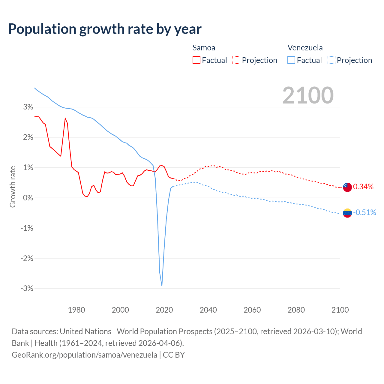 - For the last 10 years, Samoa has had an average growth rate of +0.87% per year vs -0.46% in Venezuela.