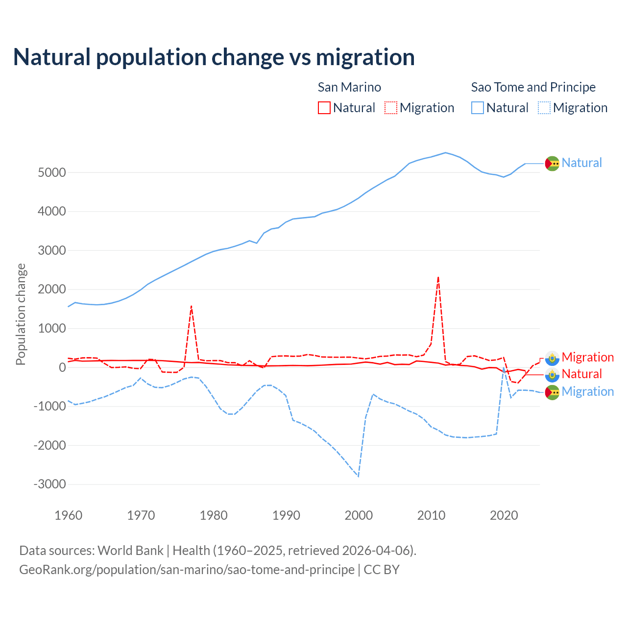 Over the last 10 years, 40.9% of the population change in San Marino is from natural causes (a loss of 358 people) and 59.1% is from migration (a gain of 517 people). In Sao Tome and Principe 80.1% is from natural causes (a gain of 50,822 people) and 19.9% is from migration (a loss of 12,621 people).