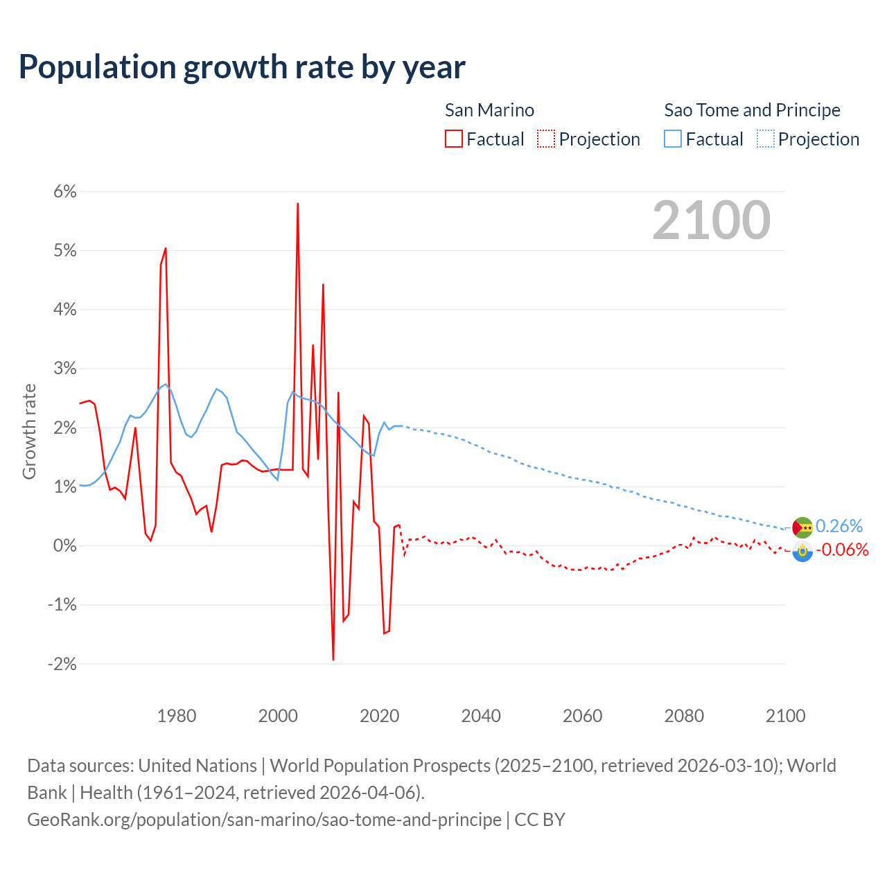 - For the last 10 years, San Marino has had an average growth rate of +0.26% per year vs +1.82% in Sao Tome and Principe.