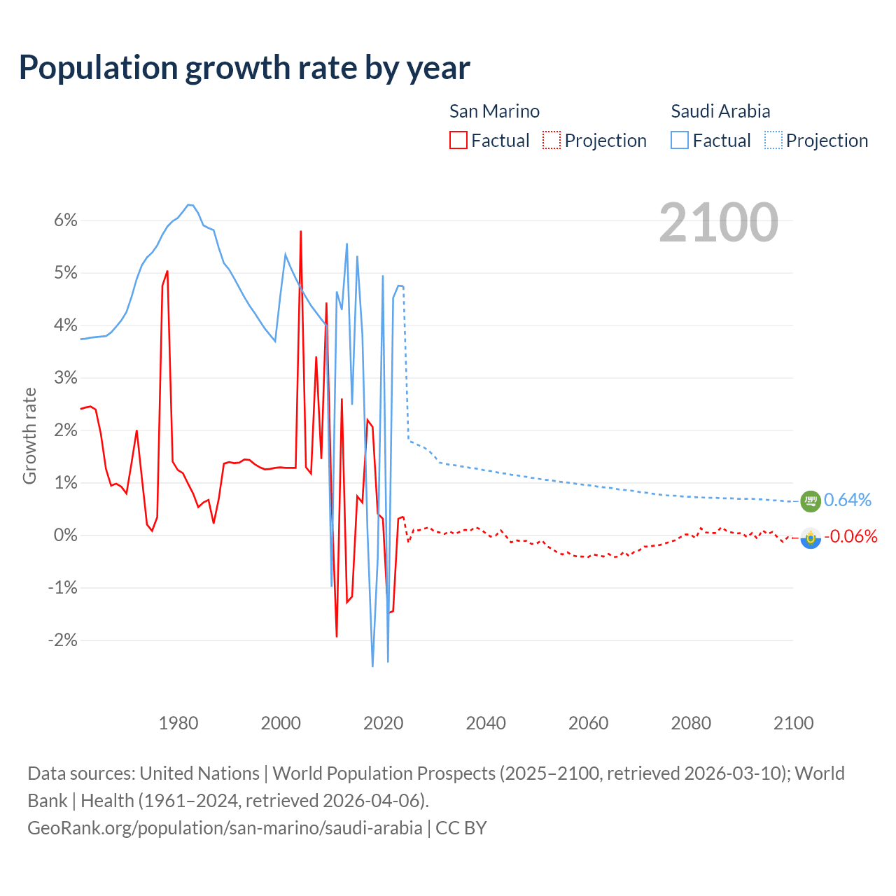 - For the last 10 years, San Marino has had an average growth rate of +0.26% per year vs +2.3% in Saudi Arabia.