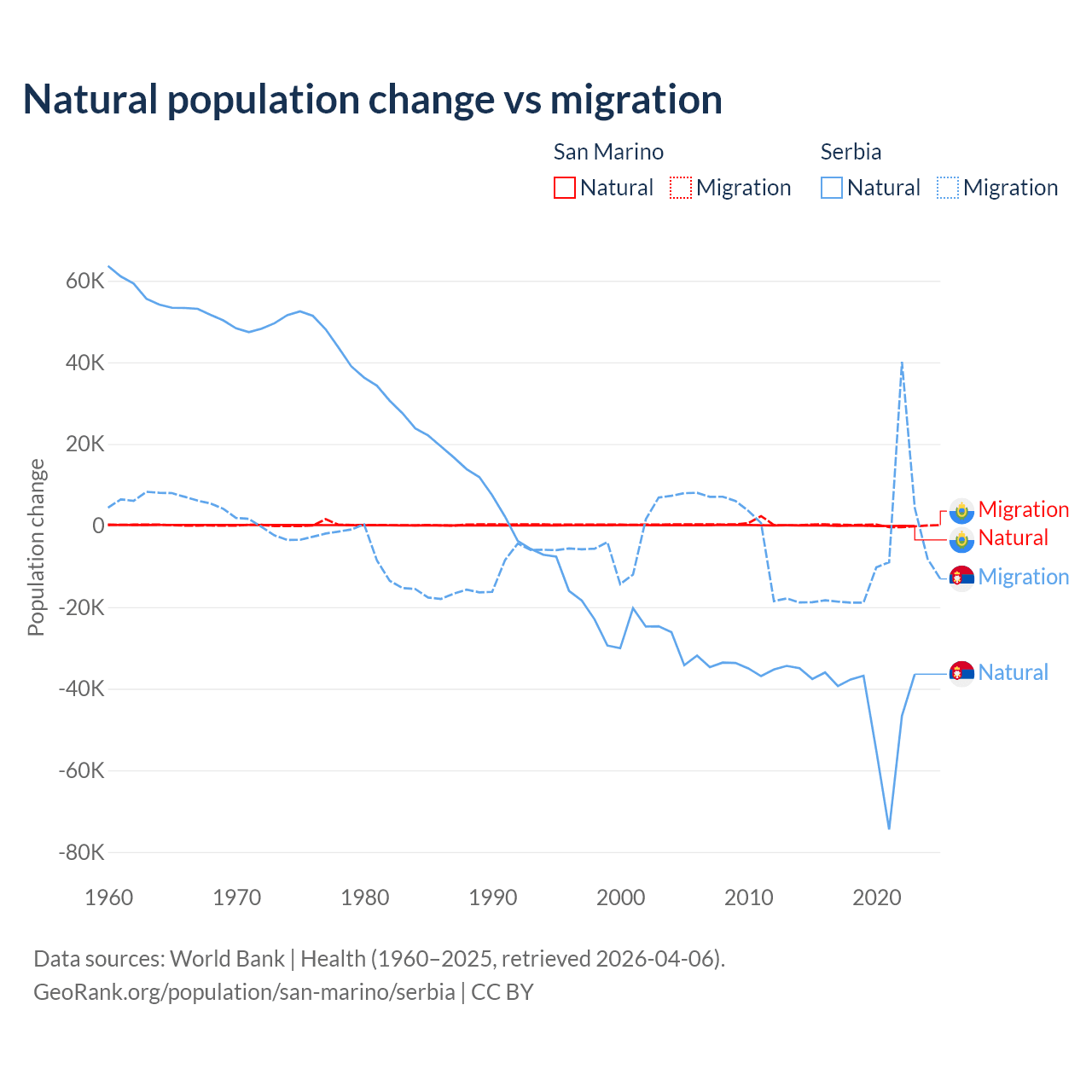 Over the last 10 years, 40.9% of the population change in San Marino is from natural causes (a loss of 358 people) and 59.1% is from migration (a gain of 517 people). In Serbia 83.3% is from natural causes (a loss of 435,148 people) and 16.7% is from migration (a loss of 87,110 people).