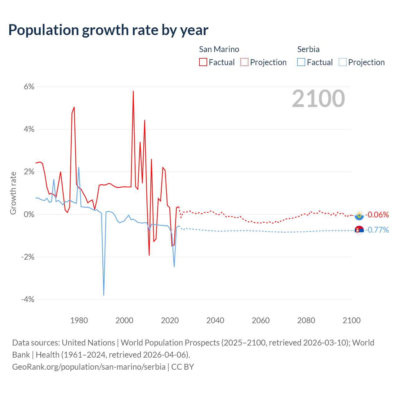 - For the last 10 years, San Marino has had an average growth rate of +0.26% per year vs -0.76% in Serbia.