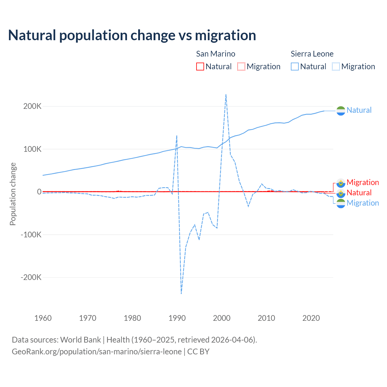 Over the last 10 years, 40.9% of the population change in San Marino is from natural causes (a loss of 358 people) and 59.1% is from migration (a gain of 517 people). In Sierra Leone 99.6% is from natural causes (a gain of 1,764,049 people) and 0.41% is from migration (a loss of 7,211 people).