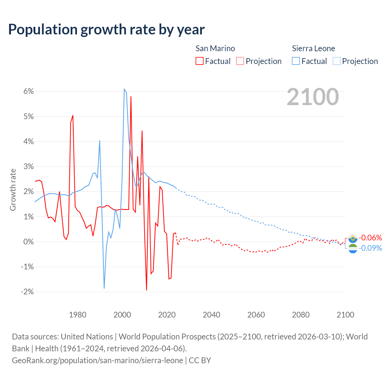 - For the last 10 years, San Marino has had an average growth rate of +0.26% per year vs +2.32% in Sierra Leone.