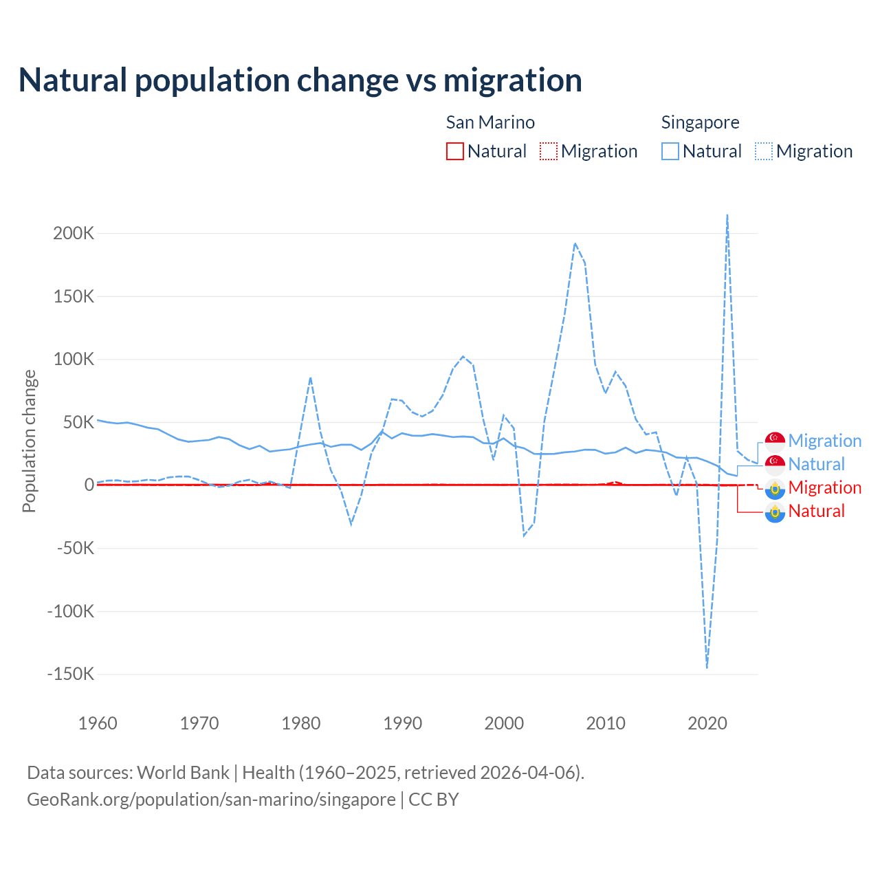 Over the last 10 years, 40.9% of the population change in San Marino is from natural causes (a loss of 358 people) and 59.1% is from migration (a gain of 517 people). In Singapore 54.8% is from natural causes (a gain of 195,953 people) and 45.2% is from migration (a gain of 161,805 people).