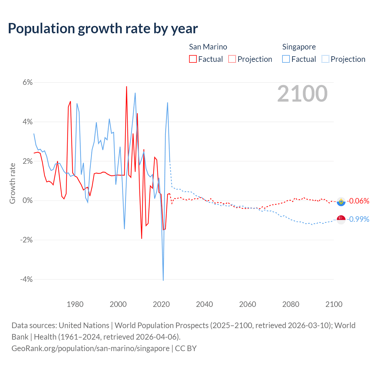 - For the last 10 years, San Marino has had an average growth rate of +0.26% per year vs +1.04% in Singapore.