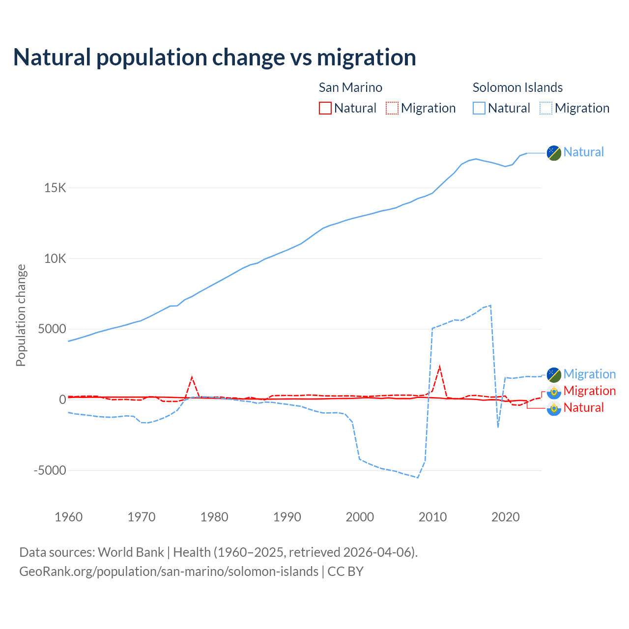 Over the last 10 years, 40.9% of the population change in San Marino is from natural causes (a loss of 358 people) and 59.1% is from migration (a gain of 517 people). In the Solomon Islands 82.8% is from natural causes (a gain of 168,727 people) and 17.2% is from migration (a gain of 35,031 people).