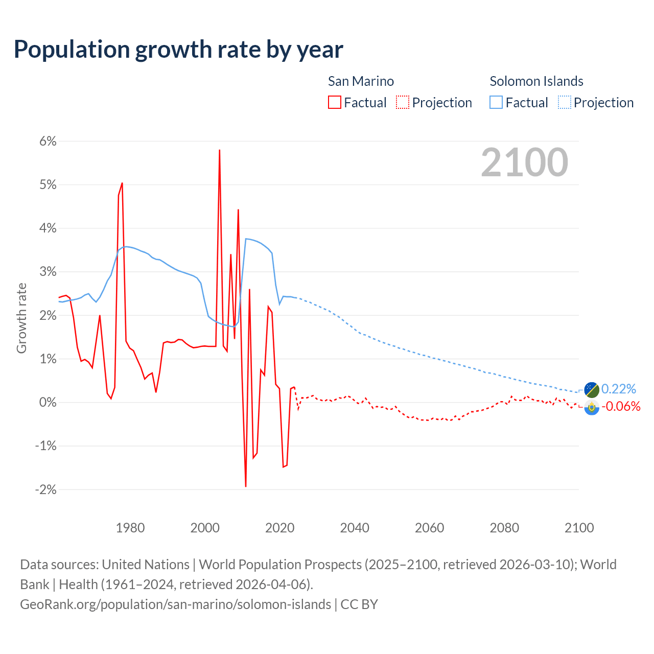 - For the last 10 years, San Marino has had an average growth rate of +0.26% per year vs +2.95% in the Solomon Islands.