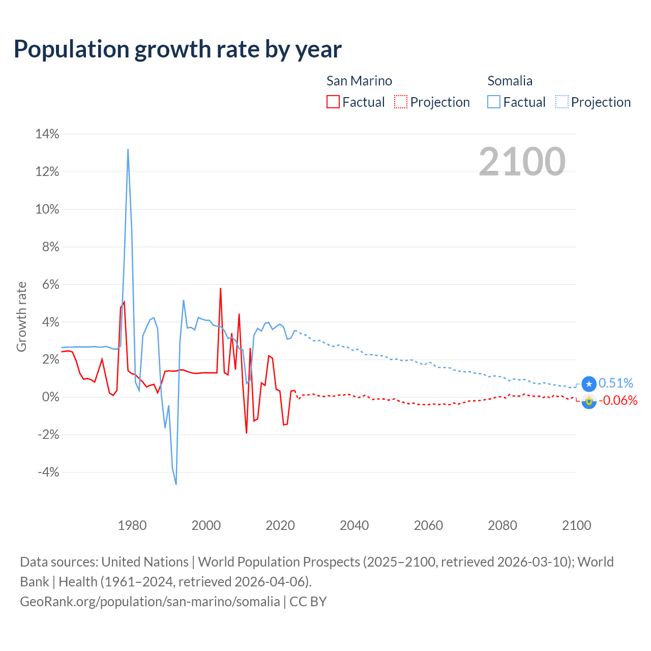 - For the last 10 years, San Marino has had an average growth rate of +0.26% per year vs +3.61% in Somalia.