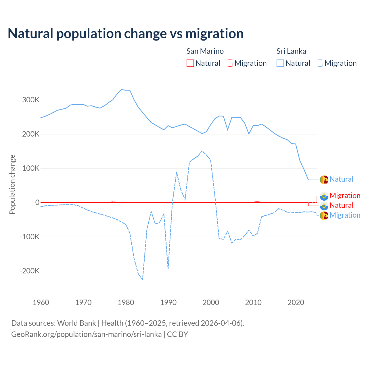 Over the last 10 years, 40.9% of the population change in San Marino is from natural causes (a loss of 358 people) and 59.1% is from migration (a gain of 517 people). In Sri Lanka 85.3% is from natural causes (a gain of 1,605,749 people) and 14.7% is from migration (a loss of 276,121 people).