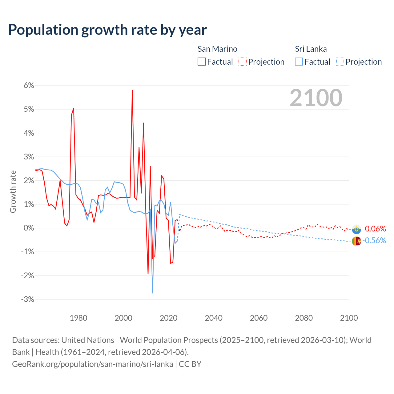 - For the last 10 years, San Marino has had an average growth rate of +0.26% per year vs +0.57% in Sri Lanka.