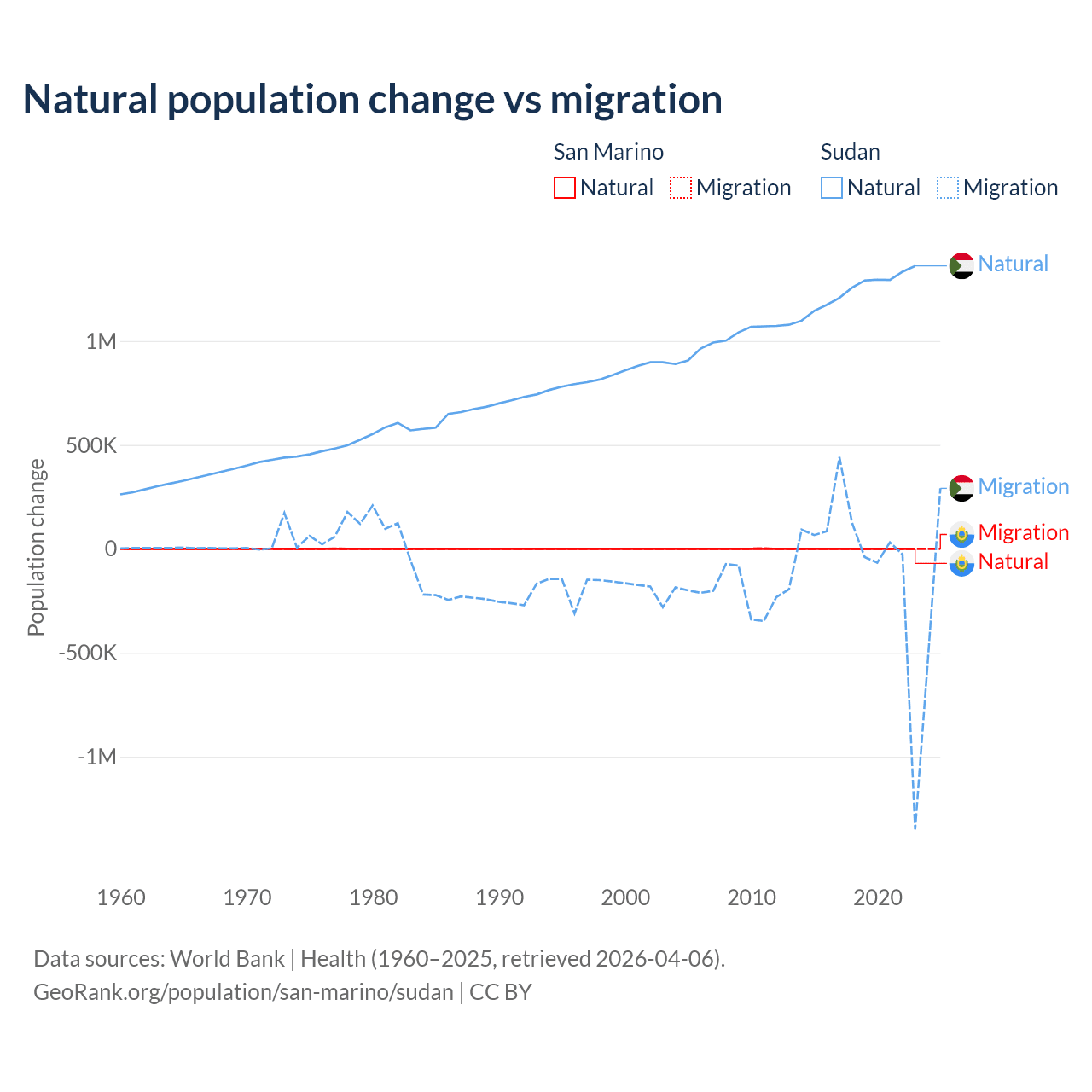 Over the last 10 years, 40.9% of the population change in San Marino is from natural causes (a loss of 358 people) and 59.1% is from migration (a gain of 517 people). In Sudan 95.1% is from natural causes (a gain of 12,459,977 people) and 4.88% is from migration (a loss of 639,596 people).