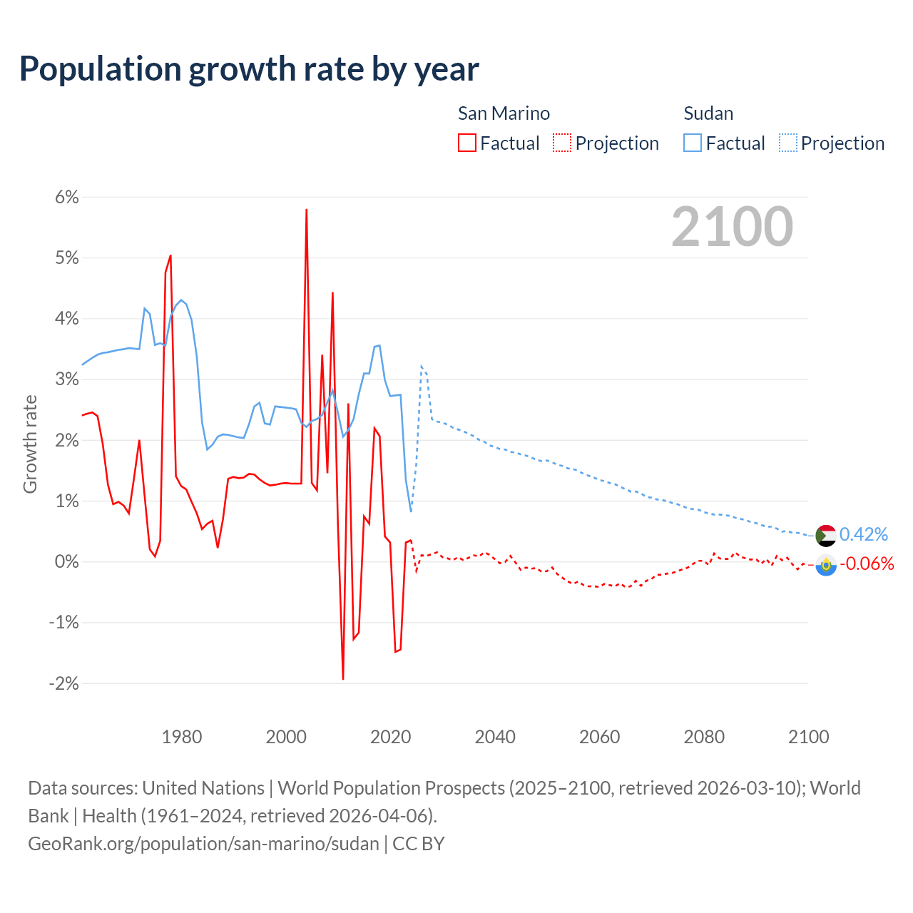- For the last 10 years, San Marino has had an average growth rate of +0.26% per year vs +2.67% in Sudan.