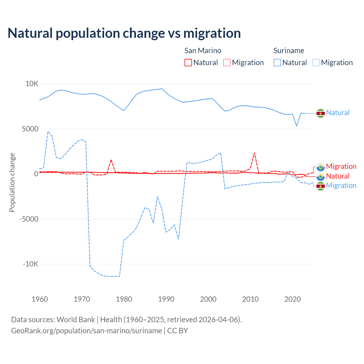 Over the last 10 years, 40.9% of the population change in San Marino is from natural causes (a loss of 358 people) and 59.1% is from migration (a gain of 517 people). In Suriname 90.3% is from natural causes (a gain of 66,709 people) and 9.72% is from migration (a loss of 7,185 people).